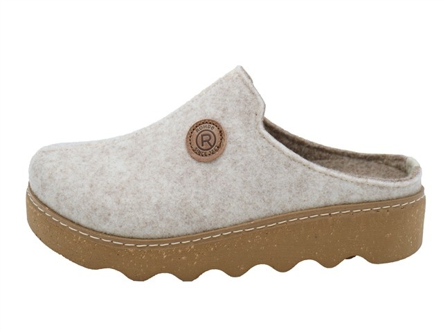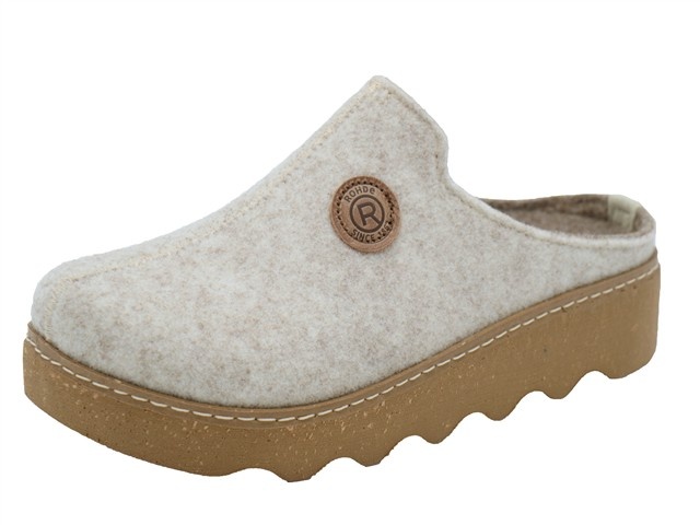 Rohde hippe en trendy dames slipper. Deze huisschoen / pantoffel van Rohde heeft een dikke rubberen lichtgewicht loopzool voor extra draagcomfort zodat je er ook mee naar buiten kunt. Het artikelnummer is: 6120-13. De kleur is Silk oftewel ecru en het materiaal is vilt. De zool is 3,5cm dik. Daarnaast heeft deze slipper een uitneembaar voetbed.