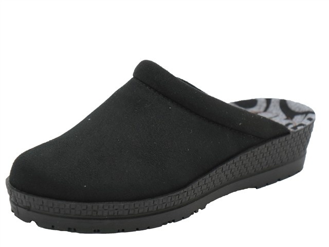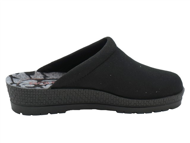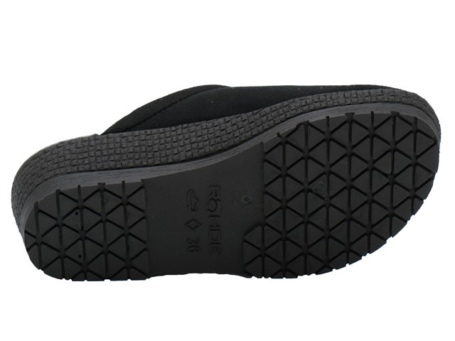 Rohde damespantoffel. Deze slipper van Rohde heeft als modelnaam Neustadt en het artikelnummer is: 2291-90. De kleur is zwart in het microvelour. De voering is een vacht voering. De hakhoogte van de slipper is 2,5cm.