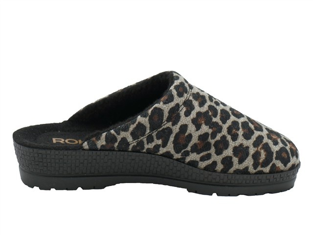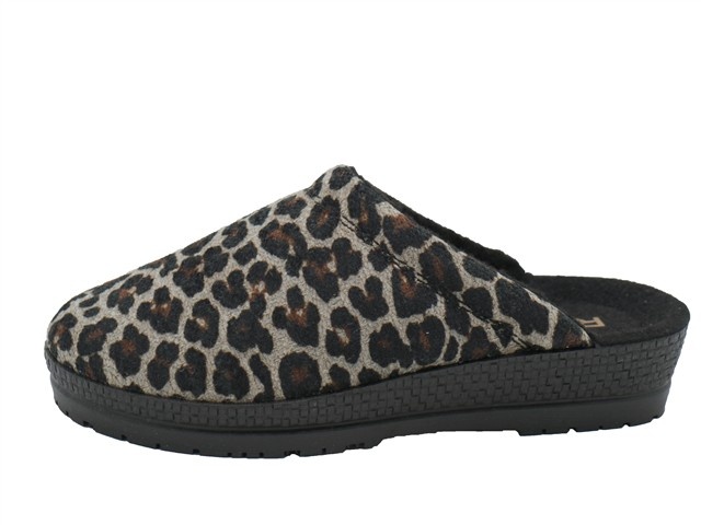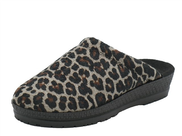 Rohde damespantoffel. Deze slipper van Rohde heeft als modelnaam Neustadt en het artikelnummer is: 2296-17. De kleur is beige/leopard oftewel beige in het leobrokat/microvelour. De voering is een vacht voering. De hakhoogte van de slipper is 2,5cm.