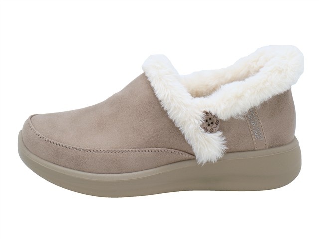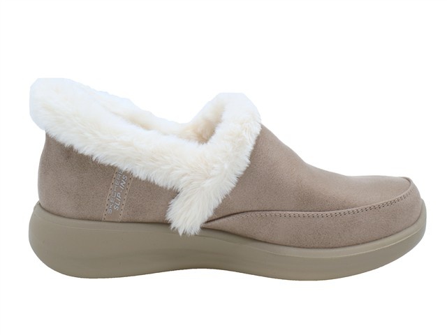 Skechers comfortabele dames pantoffel. Deze instap pantoffel van Skechers heeft als modelnaam Cozy escape en het artikelnummer is: 168114-TPE. Deze pantoffel komt uit de slip-in collectie. Dit betekent dat er een verborgen schoenlepel in de hak zit, waardoor je de schoenen aantrekt zonder je handen te gebruiken. De schoen is vegan dit betekend dat het bovenmateriaal gemaakt is van synthetisch leer met een warme vacht voering in het taupe.