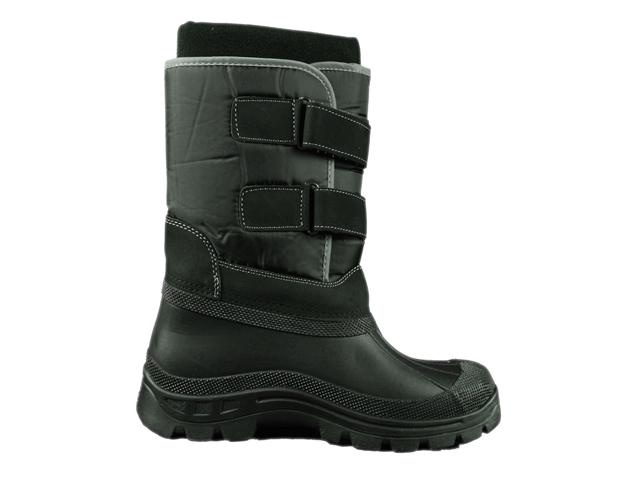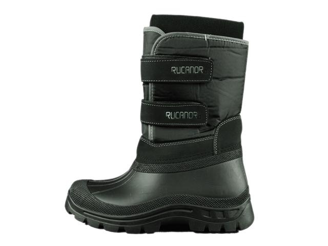 Rucanor snowboot. Deze sneeuwlaars is zwart en heeft een rubberen voet en nylon schacht. De snowboot heeft een klittenbandsluiting en een zachte voering.