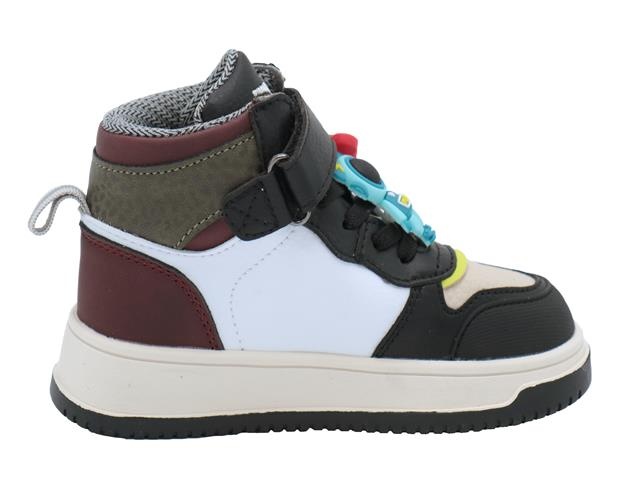 Shoesme stoere en comfortabele halfhoge jongens veterschoen. Deze high top sneaker van Shoesme heeft als modelnaam New Outsole en het artikelnummer is: NO25W100-D. De kleur is black/bordeaux oftewel zwart met wit en bordeauxrode accenten in het synthetisch leer. De voering is een tex voering wat ervoor zorgt dat de schoen waterdicht oftewel waterproof is. De sluiting is een elastieke vetersluiting met een klittenbandsluiting. Daarnaast zitten er leuke dingen op de veter, deze kunnen eraf.