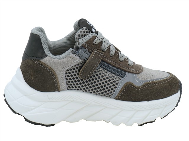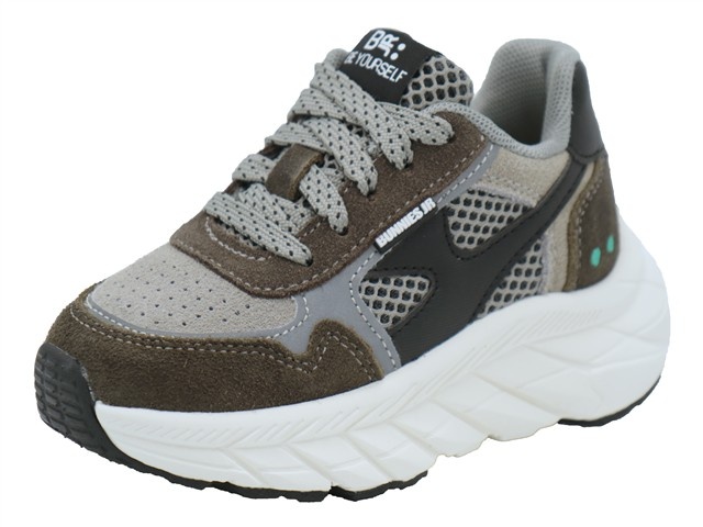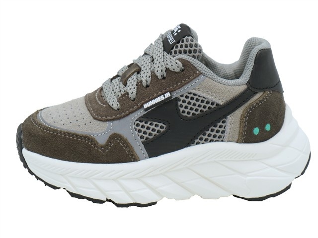 Bunnies Jr. hippe en trendy jongens sneaker. Deze veterschoen van Bunnies Jr. heeft als modelnaam Rio Rush en het artikelnummer is: 225840-488. De kleur is anthracite oftewel grijs met taupe gecombineerd. Het materiaal is een combinatie van suede en mesh. De voering is van textiel met een uitneembaar voetbed. Naast de vetersluiting heeft de sneaker ook een ritssluiting aan de binnenzijde. De zool is een stoere licht gewicht runnerzool.