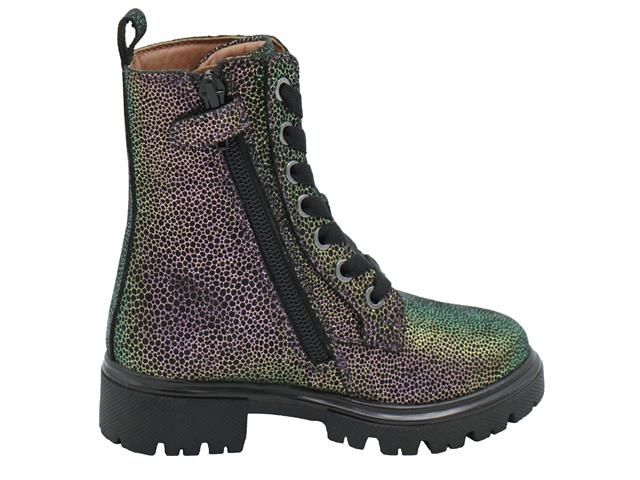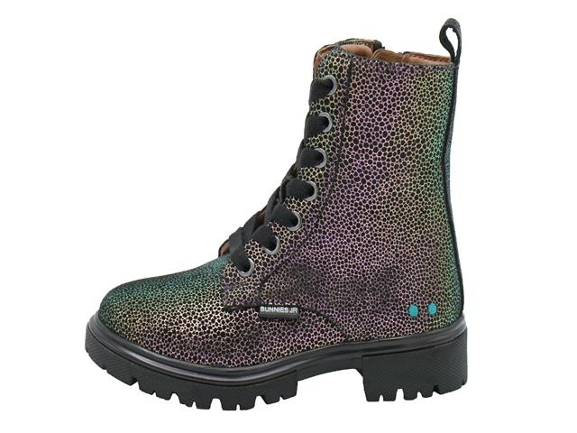 Bunnies Jr. hippe en trendy meisjes bikerboot. Deze halfhoge veterschoen van Bunnies Jr. heeft als modelnaam Saar Sterk en het artikelnummer is: 225884-698. De kleur is fantasy oftewel een multicolour schoen in het leer met een lederen voering en een leder uitneembaar voetbed. Naast de vetersluiting heeft de schoen ook een ritssluiting aan de binnenzijde zodat je de schoenen gemakkelijk aan en uit kunt trekken.