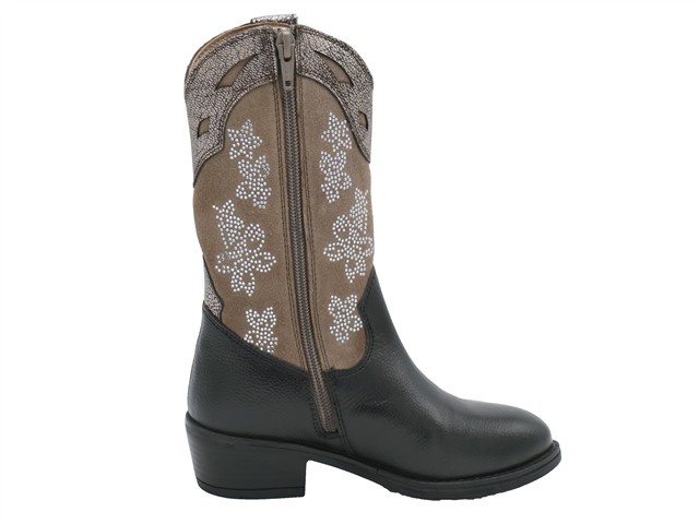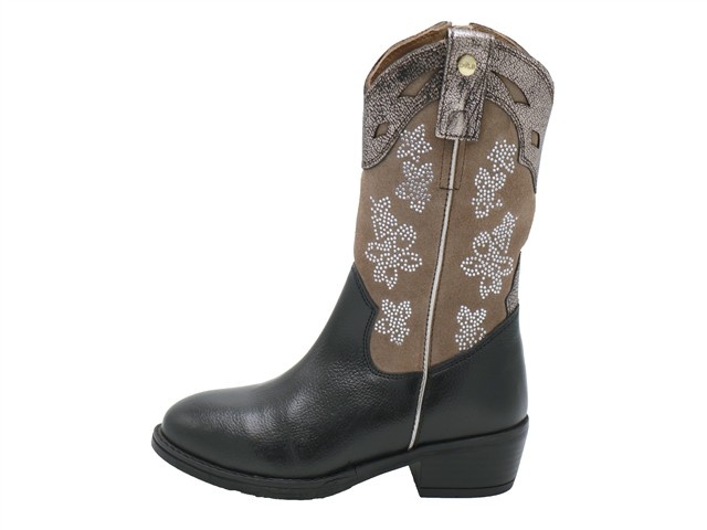 Develab trendy en hippe meisjes westernlaars. Deze stoere laarsjes in westernlook van Develab hebben als artikelnummer: 44420-999. De kleur is zwart gecombineerd met bruin en brons in het leer in combinatie met suede en trendy steentjes. De laars heeft een ritssluiting aan de binnenzijde zodat je de laarsjes gemakkelijk aan en uit kunt trekken. De voering is van leer met een leder uitneembaar voetbed. Let op, de laarsjes hebben een losse hak wat typerend is voor de westernlook alleen deze slijten sneller waardoor het mogelijk is dat je deze moet laten repareren.